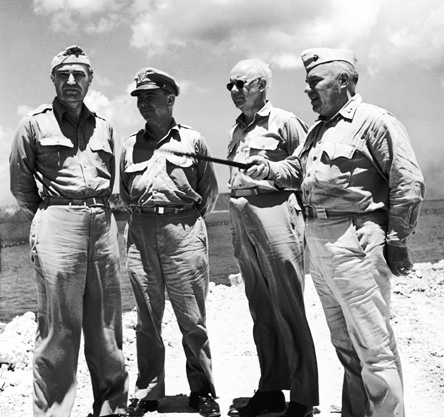 After a long and frustrating period during which Roosevelt forbade publishers from visiting the war zones, Luce finally made his way to the Pacific front in June 1945. Harry Truman, the new president, overruled Roosevelt’s ban. Luce is shown here on the left, along with Time’s managing editor, Roy Alexander, a Brooklyn Eagle reporter, and General Henry Larsen.