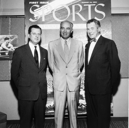 Luce’s growing interest in the importance of leisure in American life led him to support the creation of a sports magazine, a project many of his colleagues at first disdained. But because of the energy, commitment, and talent of Sidney James (left), most of Luce’s colleagues soon came to support the project. James, Luce, and Sports Illustrated publisher Harry Phillips pose in 1954 in front of a blown-up cover of the magazine’s first issue, August 16, 1954—a photograph of a baseball game in Milwaukee.