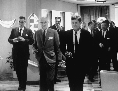 Luce’s warm relationship with Eisenhower left him with an intensified interest in other important politicians. He was particularly drawn to John Kennedy, whom he had known through John’s father for years. Kennedy is seen here walking through the Time-Life building in 1960, during his presidential campaign, after an interview with the Time Inc. editors.