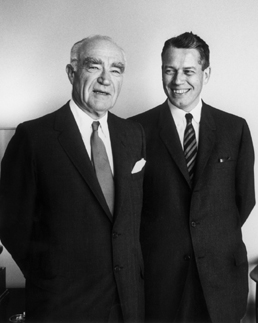 Forty-one years after Luce cofounded Time Inc., he finally handed control of the company over to Hedley Donovan, a former Fortune editor whom Luce himself chose to succeed him. They are shown here during a lavish celebration of the transition in 1964.