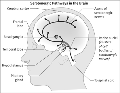 The serotonergic pathway is one with ancient evolutionary roots. Serotonergic neurons are found in the nervous systems of all vertebrates and most invertebrates, and in humans their cell bodies are located in the brain stem, in an area known as the raphe nuclei. Some of these neurons send long axons down the spinal cord, a system that is involved in the control of respiratory, cardiac, and gastrointestinal activities. Other serotonergic neurons have axons that ascend into all areas of the brain—the cerebellum, the hypothalamus, the basal ganglia, the temporal lobes, the limbic system, the cerebral cortex, and the frontal lobes. This pathway is involved in memory, learning, sleep, appetite, and the regulation of moods and behaviors. As Efrain Azmitia, a professor of biology at NYU, has noted, “the brain serotonin system is the single largest brain system known and can be characterized as a ‘giant’ neuronal system.”2