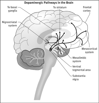 There are three major dopaminergic pathways in the brain. The cell bodies of all three systems are located atop the brain stem, in either the substantia nigra or the ventral tegmentum. Their axons project to the basal ganglia (nigrostriatal system), the limbic region (mesolimbic system), and the frontal lobes (mesocortical system). The basal ganglia initiates and controls movement. The limbic structures—the olfactory tubercle, the nucleus accumbens, and the amygdala, among others—are located behind the frontal lobes and help regulate our emotions. It is here that we feel the world, a process that is vital to our sense of self and our conceptions of reality. The frontal lobes are the most distinguishing feature of the human brain, and provide us with the godlike capacity to monitor our own selves.