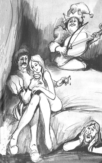 Por lo que, levantándose todas e invitado él, le condujeron a un fresco patio donde mandaron traer finísimos vinos y dulces; y al final, con palabras ingeniosas y corteses le preguntaron cómo podía ser aquello de estar él enamorado de esta hermosa señora sabiendo que era amada de muchos hermosos, nobles y corteses jóvenes.