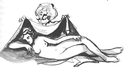 Después de esto no necesitaron más palabras. La mujer, que ardía toda en amoroso deseo, prestamente se le echó en los brazos; y después que mil veces, estrechándolo deseosamente, le hubo besado y otras tantas fue besada por él, levantándose de allí se fueron a la alcoba y sin esperar, acostándose, plenamente y muchas veces, hasta que vino el día, sus deseos cumplieron.