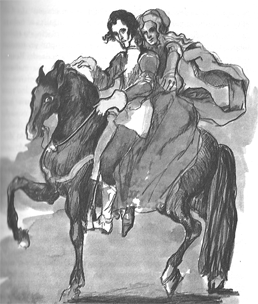 Los cuales, sorprendidos por aquello, dejando a Pietro, se volvieron en su defensa, pero viéndose mucho menos que los asaltantes, comenzaron a huir, y éstos a seguirlos, la cual cosa viendo Pietro, súbitamente cogió sus cosas y saltó sobre su jaco y comenzó a huir cuanto pudo por el camino por donde había visto que la joven había huido.