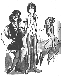 El jovencillo le dijo todo; no menos contento Pietro de haberlo encontrado que dolida su mujer, cogiéndolo de la mano se lo llevó con él a la alcoba, en la cual la mujer con el mayor miedo del mundo lo esperaba.