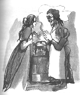 Ghichibio, que era un fantoche tan grande como lo parecía, preparada la grulla, la puso al fuego y con solicitud comenzó a guisarla. La cual, estando ya casi guisada y despidiendo un grandísimo olor, sucedió que una mujercita del barrio, que se llamaba Brunetta y de quien Ghichibio estaba muy enamorado, entró en la cocina y sintiendo el olor de la grulla y viéndola, rogó insistentemente a Ghichibio que le diese un muslo.
