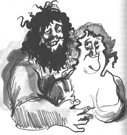 A éste, al dejarlo en el albergue, fray Cebolla le había mandado que mirase bien que nadie tocase sus cosas, y especialmente sus alforjas que es donde estaban las cosas sagradas; pero Guccio Imbratta, que más gustaba de estar en la cocina que el ruiseñor sobre las verdes ramas, y máximamente si a alguna sirvienta olía por allí, habiendo visto a una del hospedero, grasienta y gruesa y pequeña y mal hecha, con un par de tetas que parecían dos canastas de abono y con una cara que parecía de los Baronci, toda sudada, mugrienta y ahumada, no de otro modo que el buitre se arroja sobre la carroña, abandonando la cámara de fray Cebolla y todas sus cosas, allá se dejó caer.