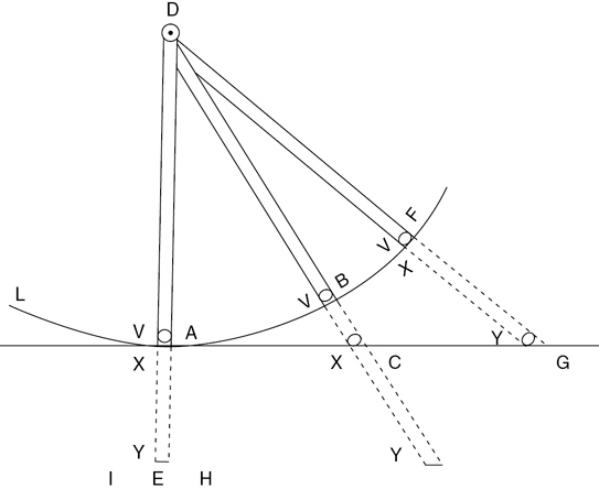 For example, suppose a stone is moving in a sling along the circle marked AB and you consider it precisely as it is at the instant it arrives at point A: you will readily find that it is in the act of moving (for it does not stop there) and of moving in a certain direction (that is, toward C), for it is in that direction that its action is directed in that instant. But you can find nothing there that makes its motion circular. Thus, supposing that the stone then begins to leave tile sling and that God continues to preserve it as it is at that moment, it is certain that He will not preserve it with the inclination to go circularly along the line AB, but with the inclination to go straight ahead toward point C.