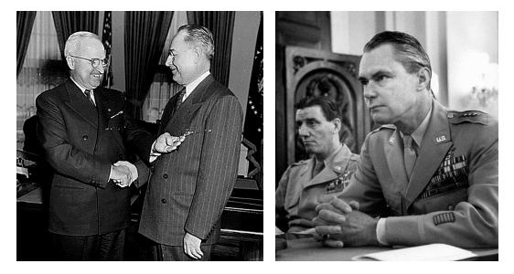 Left: President Truman pins a medal on the first director, Rear Admiral Sidney Souers. Right: General Hoyt Vandenberg, the second director, testifies before Congress.