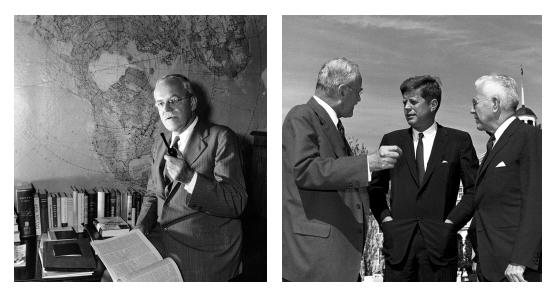 Left: Allen Dulles at his headquarters office in 1954. Right: JFK replaced Dulles with John McCone after the Bay of Pigs.