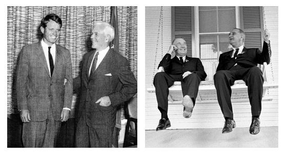 Left: McCone became close to Attorney General Robert Kennedy who played a central role in covert operations. Right: President Johnson rejected McCone and hired the hapless Admiral Red Raborn, at the LBJ Ranch in April 1965.