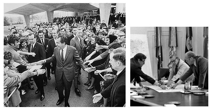 Left: President Nixon presses the flesh at CIA headquarters in March 1969. Nixon distrusted the agency and scorned its work. Right: George H. W. Bush and President Gerald R. Ford discussing evacuating Americans from Beirut with L. Dean Brown, special envoy to Lebanon, June 17, 1976.