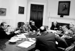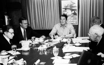 In June 1985, President Reagan and his national security team in the White House Situation Room during the hijacking of a TWA flight bound for Beirut, a hostage drama that ended with a secret deal; Bill Casey is at far right.