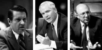The end of the cold war created a revolving door at the top of the CIA--five directors in six years. The constant changes coincided with an exodus of expertise among covert operators and analysts. Left to Right: William Webster; Robert Gates, the last career CIA officer to lead the agency; and Jim Woolsey.