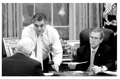 George Tenet at the White House with President Bush and Vice President Cheney as the war on Iraq begins in March 2003. Tenet confidently stood by the CIA in saying that Saddam Hussein's arsenal bristled with weapons of mass destruction.