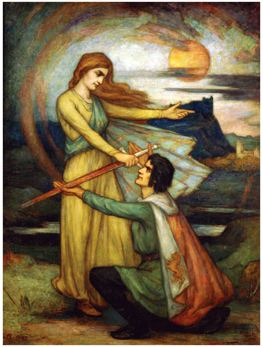 13 Robert the Bruce receiving the Wallace Sword from the Spirit of Scotland in the guise of the Lady of the Lake, at Stirling, on the eve of Bannockburn. Painting at a time when our ancient freedoms were under threat from Nazism and Fascism, 1943. Oil on canvas by Stewart Carmichael (1867–1950). Stirling Smith Art Gallery and Museum