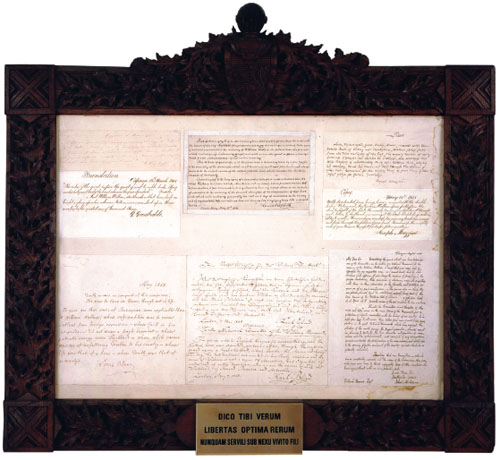 15 Letters of the European Liberators framed in the Wallace Oak of Elderslie, secured by fundraiser John McAdam (1806–1883) for the National Wallace Movement. Stirling Smith Art Gallery and Museum