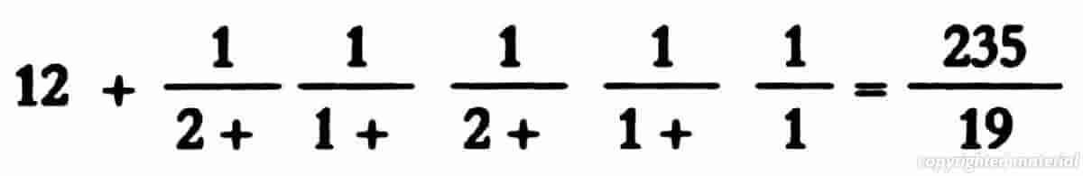 Meton's cycle depended on the discovery that 235 synodic months or lunations (new moon to new moon) are very nearly equal to 19 tropical years (vernal equinox to vernal equinox). This can be easily checked, since the mean synodic month is about 29.5306 days and the tropical year, as we have seen in Appendix 1, is about 365.2422 days. The Metonic ratio can be attained by calculating the fifth convergent of the simple continued fraction for the decimal part of the number of months in the year. This gives the ratio as