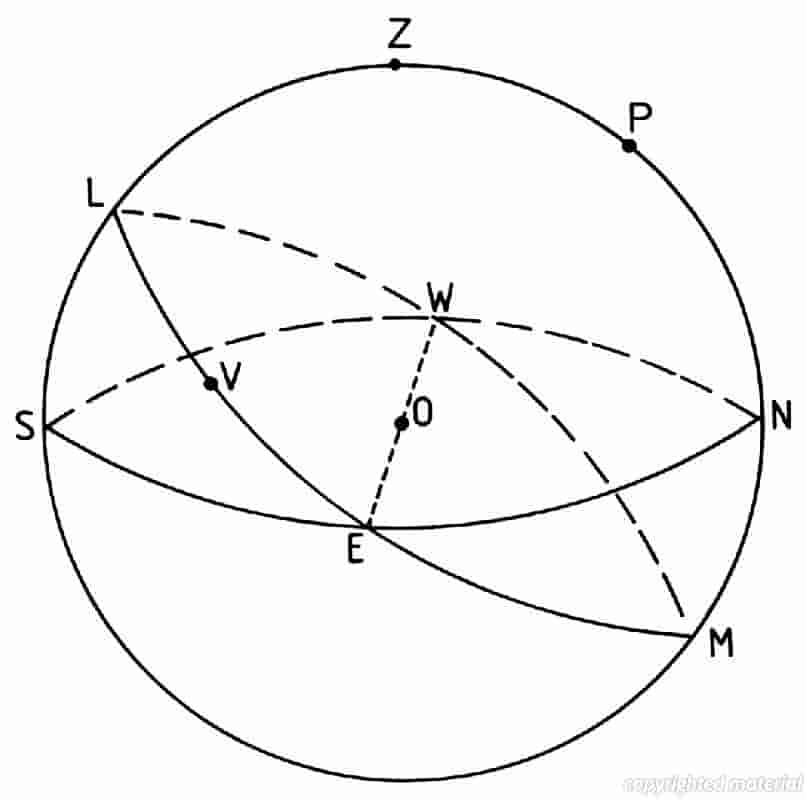 Fig. 5 The celestial sphere. Since they are so remote, the so-called 'fixed stars' (as distinct from planets, satellites, comets, and so on) can be depicted as fixed points on a sphere with a radius that is very large compared with the radius of the earth's annual orbit around the sun. The lines from all observers on earth to any given star will therefore cut this sphere, known as the 'celestial sphere', at the same point. Consequently, any observer O can be regarded as being at the centre of the celestial sphere. Because of the earth's diurnal rotation, the celestial sphere appears to rotate daily about the line joining the earth's north and south poles. In accordance with standard mathematical terminology, any circle on the celestial sphere which has its centre at O is called a 'great circle'. (Lines of longitude on the earth's surface are also great circles, whereas lines of latitude, except the equator, are not, being only so-called 'small circles'.) In the above figure the great circle ENWS represents the horizon of O, with its pole at the zenith- point Z. Similarly, the great circle ELWM represents the celestial equator (projection of the terrestrial equator on to the celestial globe). Its north pole is at P, the so-called 'Pole Star' being close to it. V represents the vernal equinox (first point of Aries). The ecliptic (projection on to the celestial sphere of the sun's apparent annual path against the general background of the stars, due to the earth orbiting the sun) is the great circle through V that lies in the plane cutting the plane of the celestial equator at an angle of approximately 23½ degrees. The earth's axis of diurnal rotation is in the direction OP. The celestial sphere rotates about the line joining O to the poles of the ecliptic in a top-like motion. This 'precession of the equinoxes' has a period of nearly 26,000 years.
