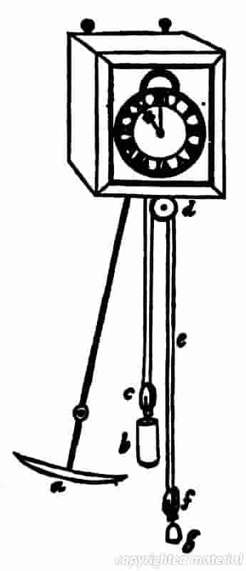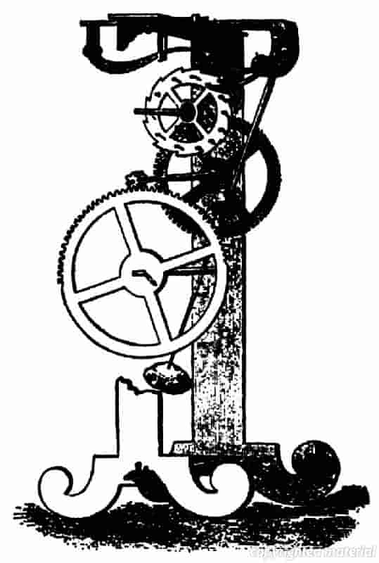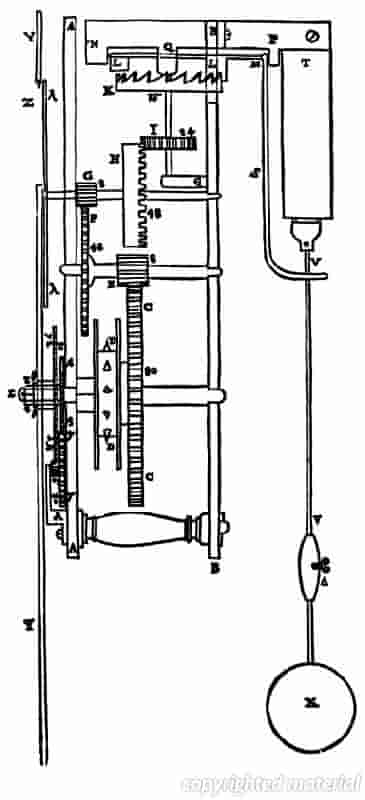 Fig. 6 A drawing of Galileo's pendulum clock. In 1637 Galileo devised a train of wheels actuated by a pendulum for counting oscillations, but the pendulum had to be controlled by hand. In 1641, the year before he died, Galileo considered how the pendulum itself could be used as a clock. In 1649 his son, Vincenzio, tried to construct a clock based on his father's design, but he died before completing it. (An inventory of his effects included an unfinished pendulum clock.) In 1659 a drawing by Galileo's friend and biographer Viviani of a clock based on Galileo's ideas was sent by one of his former disciples, Prince Leopold dei Medici, brother of the Grand Duke of Tuscany, to the French astronomer Ismael Boulliau. He passed it on to his friend Christiaan Huygens, who received it in January 1660. This drawing is reproduced above. Galileo's pendulum clock involved a new type of escapement which--was superior to the traditional verge type retained by Huygens. Each swing of the pendulum pushes the top wheel from one projecting pin to the next.