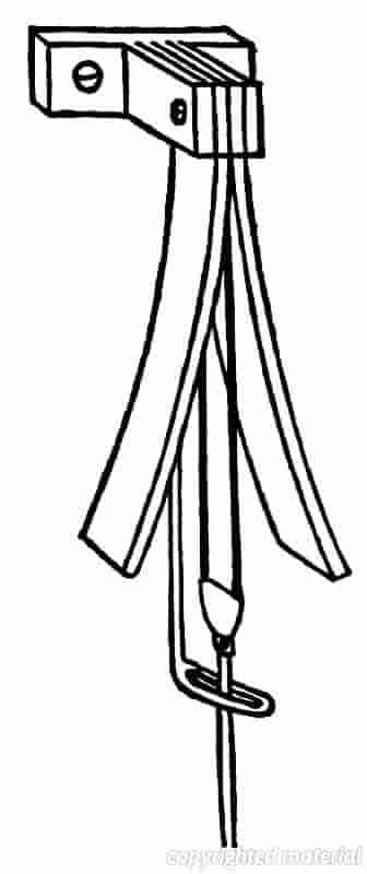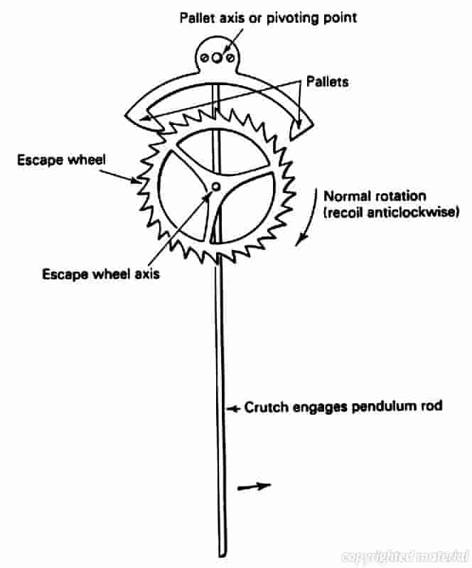 Fig. 8 The anchor escapement.The anchor escapement consists of a wheel with pointed teeth and an anchor carrying, at places equidistant from its axis, two pallets which catch the teeth of the wheel in succession as each escapes from the action of the other.
