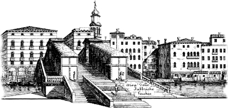 The Rialto grew and grew. Outlying streets were cleared and widened; the canals were improved, and docks constructed. In the 1280s the Rialto Nuovo was erected to the west of the original market and, thirty years later, the Campo di Rialto was enlarged. There was a general desire to bring harmony and even dignity to this commercial scene; a great map of the world was placed on the wall of its principal colonnade. There was a prison, and a pillar for public proclamations. There were warehouses, too, and government offices for the administration of trade. The patricians met and mingled within a loggia or open-sided gallery at the base of the Rialto bridge. When much of the neighbourhood was destroyed by fire in 1514, it was rebuilt on the same pattern with the streets or “blocks” running parallel to each other. The essential conservatism of the Venetians required that they should preserve the old forms. The passageways of the Rialto, like a souk out of the East, had become the natural expression of trade.