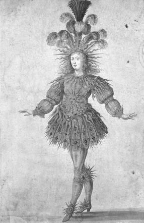 Figure 4.1 Louis XIV costumed as the sun in the Ballet de la Nuit, 1653. Pen, wash, and gouache touched with gold. Workshop of Henry de Gissey, contemporary illustration. Bibliothèque nationale de France. Photograph: Réunion des Musées Nationaux / Art Resource, NY.