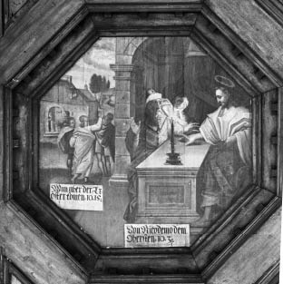 Figure 3.1 “Von Nicodemo dem Obersten. JO[hannes] 3,” ceiling panel in the Carmelite convent of Himmelspforten, Würzburg, 1613, showing Nicodemus by candlelight.