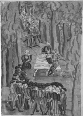 The authorities did not intervene at the Hessian meeting described above, but a similar gathering in a forest outside Zurich on September 5, 1574 was encircled and broken up by the Zurich city guard: the two missionaries from Moravia who led the service were arrested. A Zurich report of the incident included a hand-colored drawing of the Moravians preaching by candlelight at a table in the forest (Figure 3.3).36 The image of reading or preaching by candlelight in the forest recurs in other accounts.