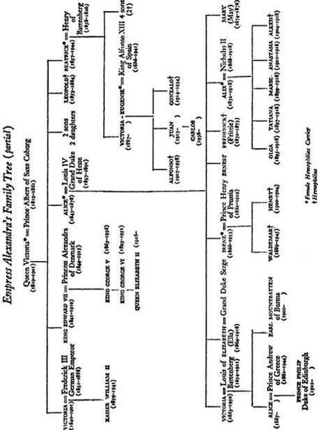 It is impossible to trace exactly the course of one of the overwhelming influences in this drama: the defective gene which Queen Victoria passed to her descendants. Until recently, when plasma and powerful plasma concentrates become available, hemophilia, like other recessive hereditary diseases, tended to die out of afflicted families by the process of attrition. In Queen Victoria’s enormous clan, this pattern has been followed. Among the fourth generation—the Queen’s great-grandchildren—there were six hemophiliacs. Alexis was one of these. Two of the others were Crown Prince Alfonso and Prince Gonzalo, the sons of Alfonso XIII, the last king of Spain. Both brothers were killed as young men in automobile accidents, Gonzalo in Austria in 1934 and Alfonso in Miami in 1938. In both cases, except for uncontrolled hemorrhaging, their injuries would have been minor. The fifth generation of Victoria’s family, which includes both Queen Elizabeth II and her husband, Prince Philip, has been free of hemophilia, as has the sixth. It is possible that the mutant gene may still exist in the carrier state among Queen Victoria’s female descendants and could suddenly appear in a future boy. But with the passing of successive generations, that possibility, already distant, will become exceedingly remote.