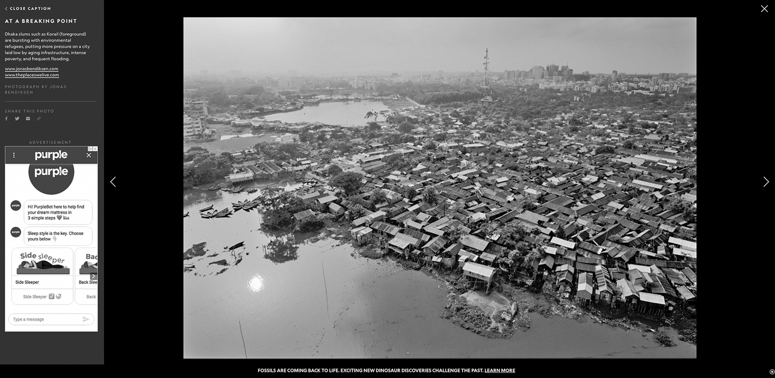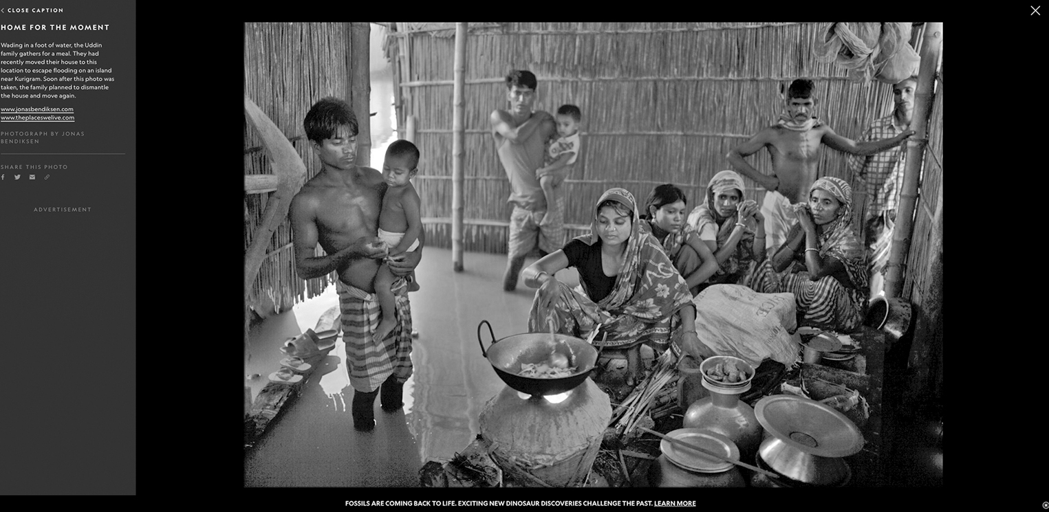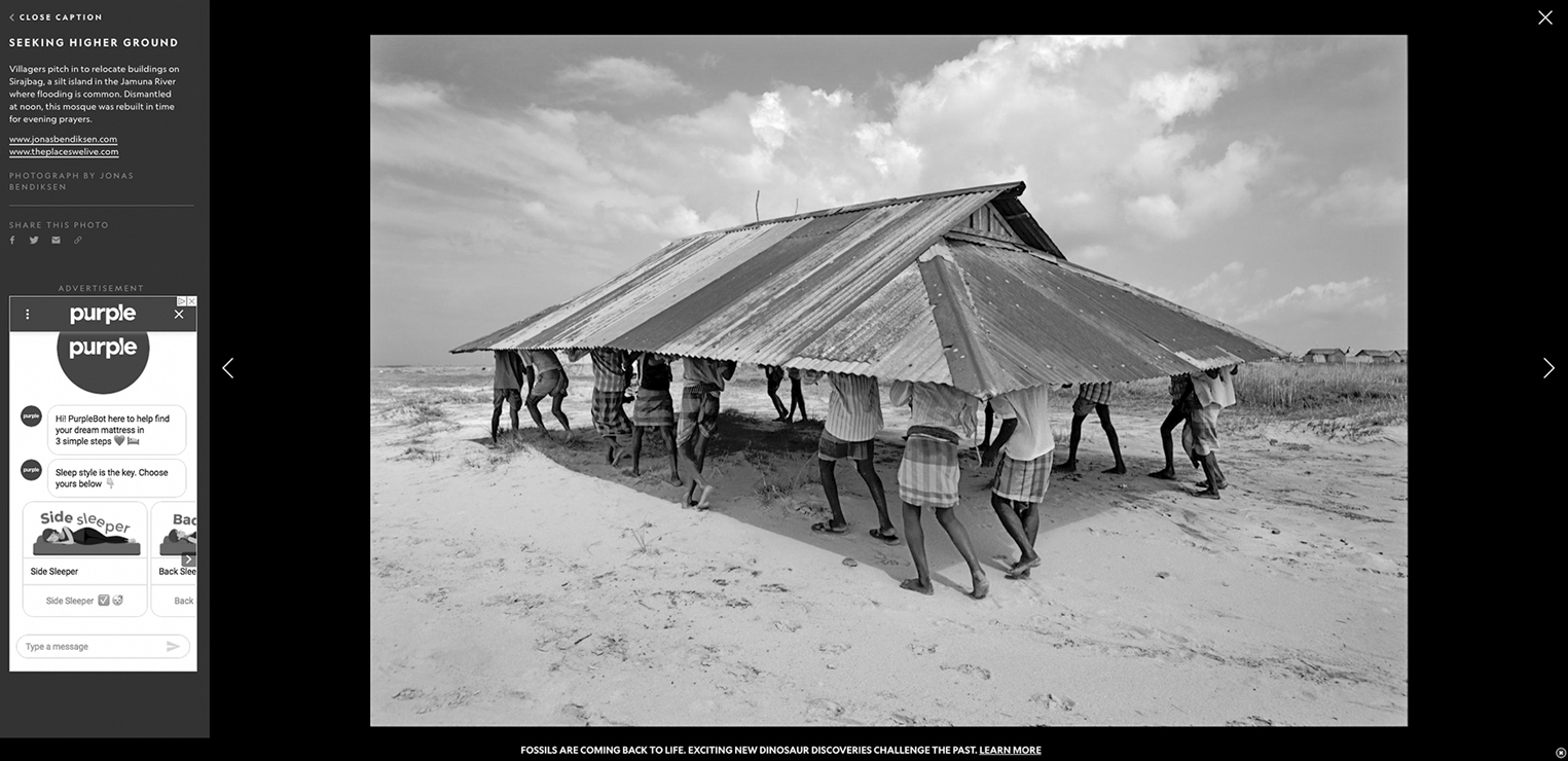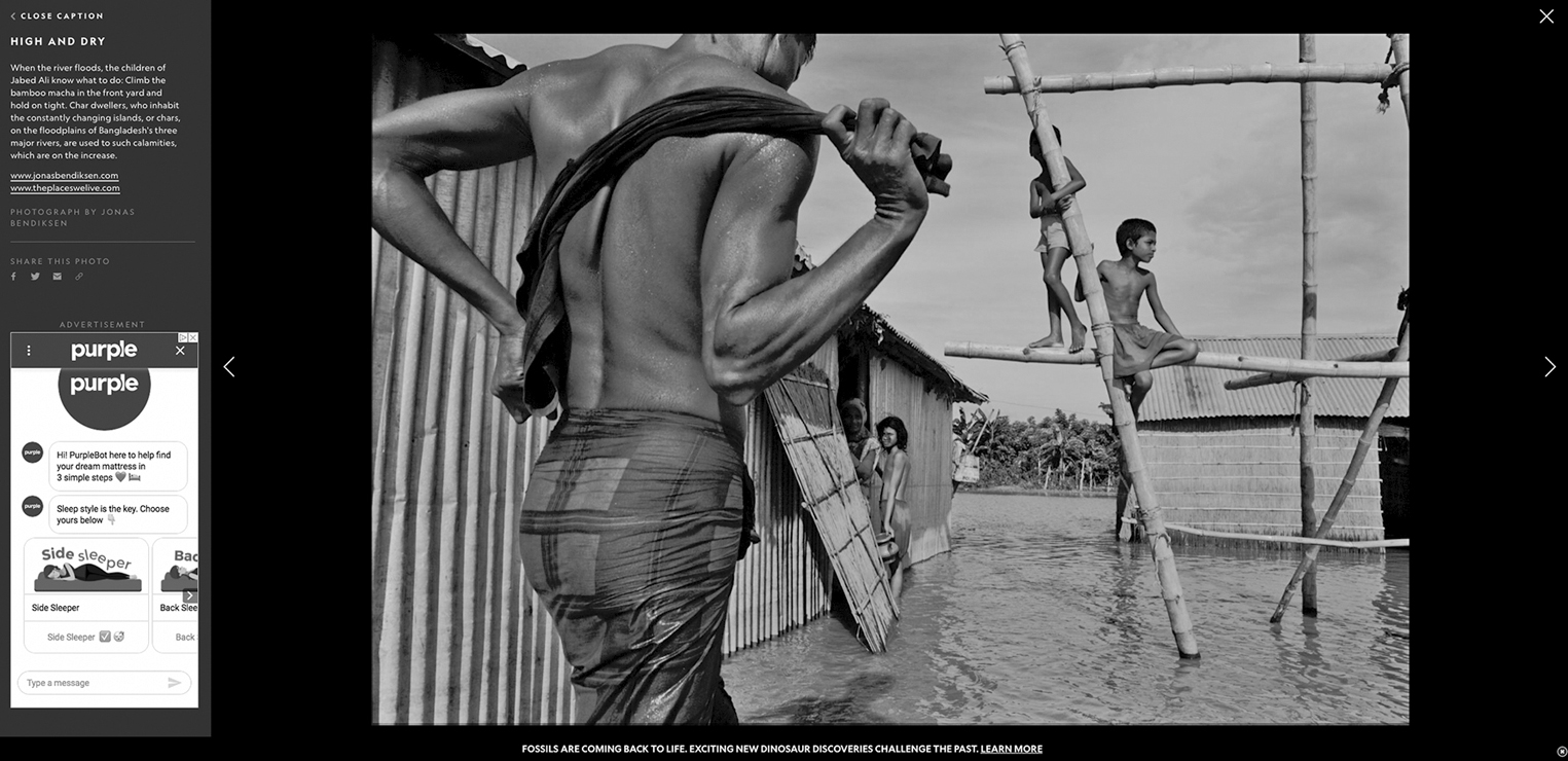 Jonas Bendiksen’s photos accompanying the National Geographic essay serve to illustrate the purported ability of the char dwellers to flexibly adapt to rising waters. This isn’t a generic claim, as the images literally depict people living in inundated houses. Rather than maintaining the tragic mode for representing flooding that must cause sustained difficulty in the household labor needed to reproduce the family unit, the image slideshow depicts the char dwellers as modeling efforts needed for climate adaptation—in this case displaced from any responsibility of polluters or the state as individuals develop makeshift water avoidance strategies. Several of the photos employ the convention of visually dividing the scene into two areas via an infrastructural cut through the landscape, such as a road or a waterway, depicting the movement of migrants through the landscape or creating a temporal dimension of transition through the contrast between the two sides of the frame. Such cues are aimed at a viewer presumed to be outside Bangladesh, whose vision of the images is framed by captions containing brief ethnographic descriptions of the people and the country, accompanied by algorithmically targeted hypertext ads for consumer goods and a lower banner connecting to other stories, such as an article concerning dinosaur fossils.