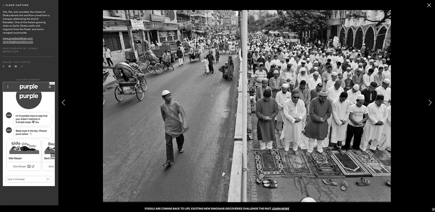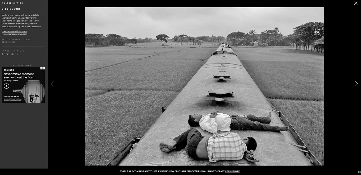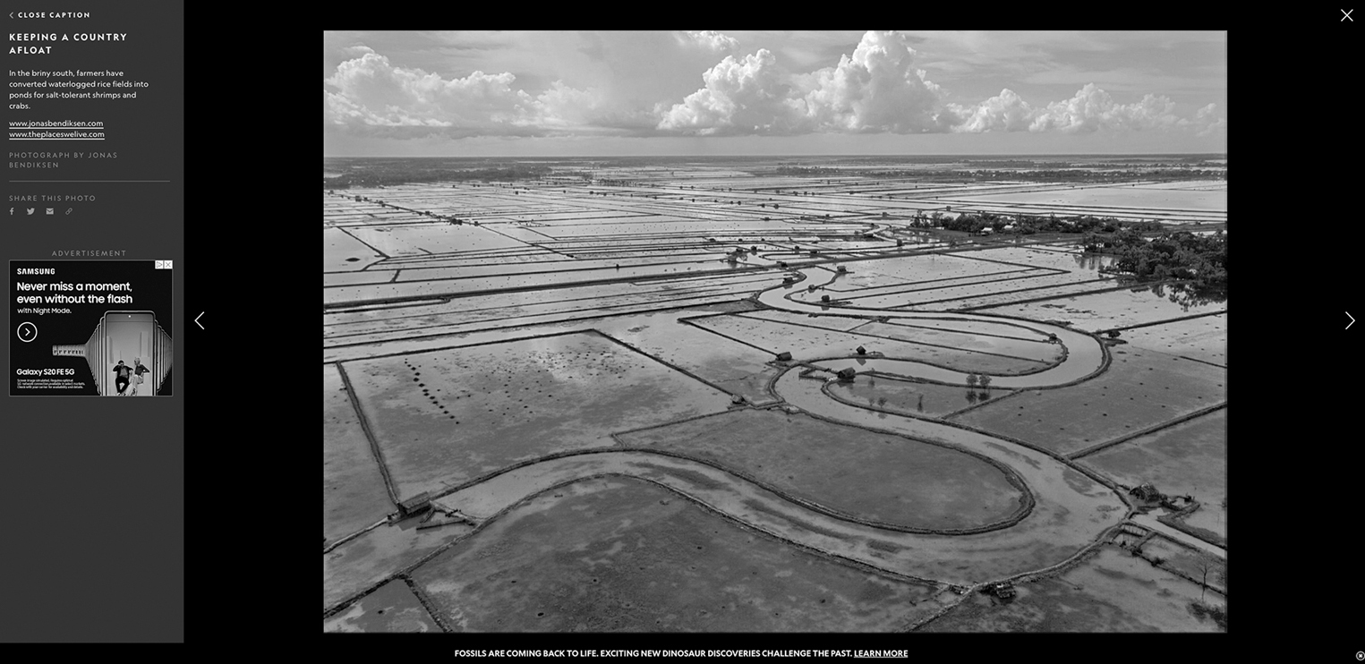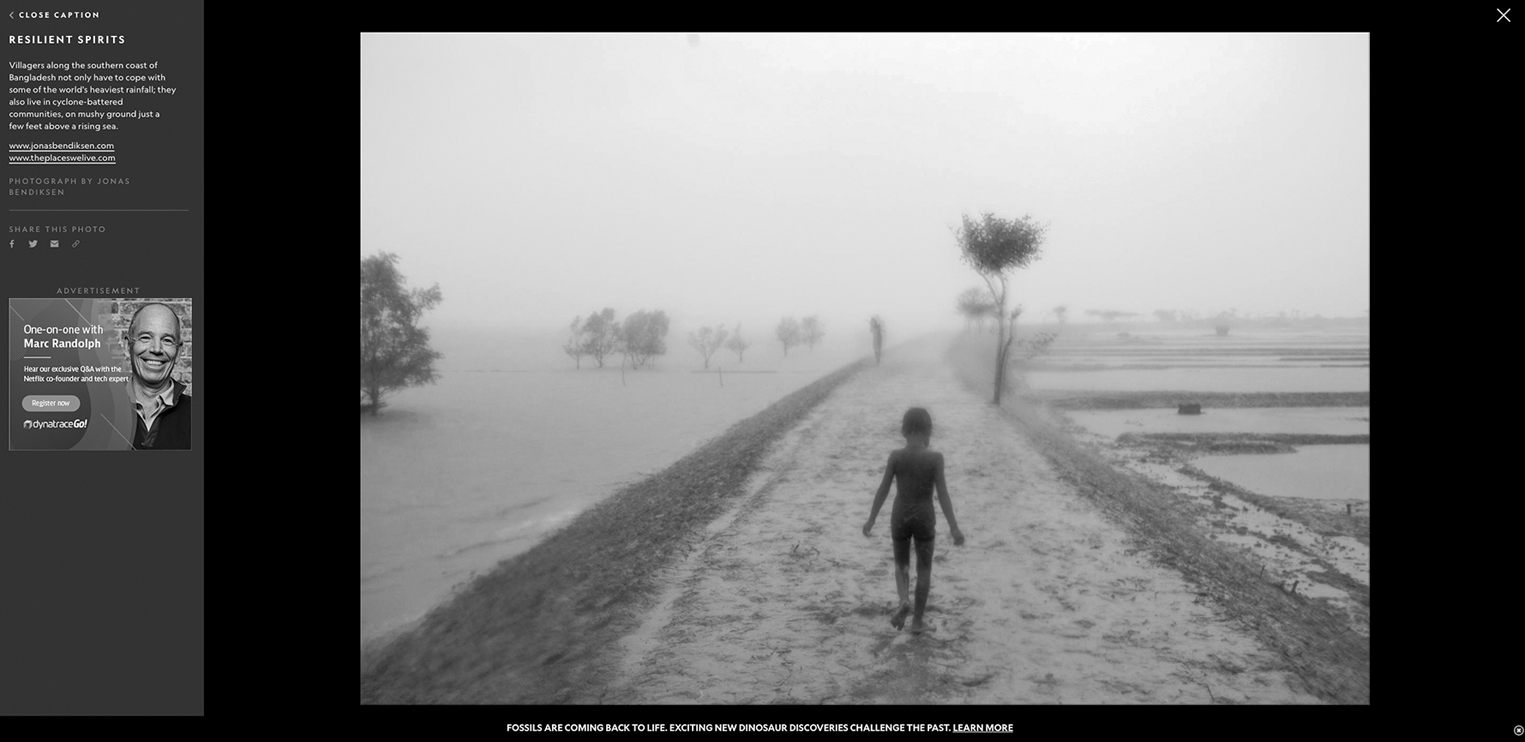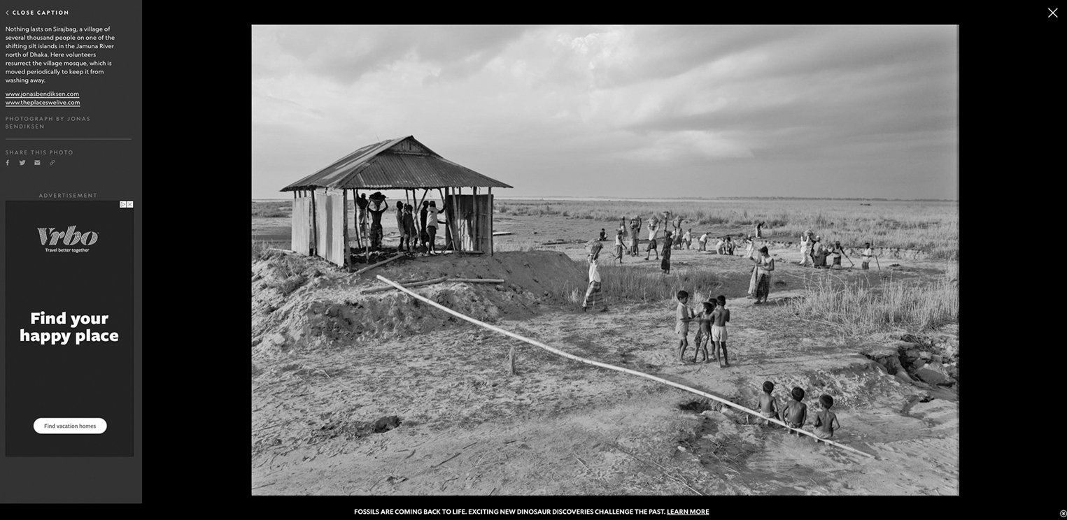 Jonas Bendiksen’s photos accompanying the National Geographic essay serve to illustrate the purported ability of the char dwellers to flexibly adapt to rising waters. This isn’t a generic claim, as the images literally depict people living in inundated houses. Rather than maintaining the tragic mode for representing flooding that must cause sustained difficulty in the household labor needed to reproduce the family unit, the image slideshow depicts the char dwellers as modeling efforts needed for climate adaptation—in this case displaced from any responsibility of polluters or the state as individuals develop makeshift water avoidance strategies. Several of the photos employ the convention of visually dividing the scene into two areas via an infrastructural cut through the landscape, such as a road or a waterway, depicting the movement of migrants through the landscape or creating a temporal dimension of transition through the contrast between the two sides of the frame. Such cues are aimed at a viewer presumed to be outside Bangladesh, whose vision of the images is framed by captions containing brief ethnographic descriptions of the people and the country, accompanied by algorithmically targeted hypertext ads for consumer goods and a lower banner connecting to other stories, such as an article concerning dinosaur fossils.
