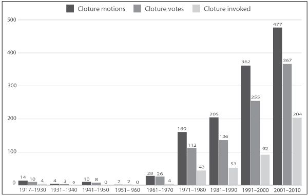 Sources: Congressional Research Service, “Senate Cloture Rule: Limitation of Debate in the Senate of the United States,” (Washington, DC: US Government Printing Office, 2011); Sarah A. Binder, and Steven S. Smith, Politics or Principle? Filibustering in the United States Senate (Washington, DC: Brookings Institution Press, 1997), 7. |