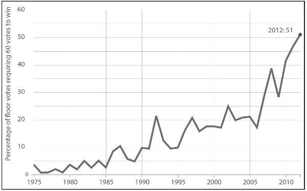These overall figures underestimate the importance of supermajority votes because many uncontroversial decisions on relatively unimportant matters are achieved by simple majorities. That is, the figures represent not only the raw increase in three-fifths thresholds but also the increase in the proportion of important decisions made by a supermajority vote. Even in the contemporary era of extreme polarization, a good number of things in the Senate receive unanimous or nearly unanimous support, particularly presidential nominations to the executive branch and even many judicial nominations. As well, on a few important bills and resolutions, the Senate can allow for a more or less open amendment process. For example, the Senate budget resolution, which is protected from filibusters by the Budget Act, facilitates the consideration of amendments, most of which are dealt with very quickly, one after another, in what has been dubbed a vote-a-rama. As an example, in the first session of the 113th Congress in 2013, forty-six such amendments were decided by roll call votes as part of the Senate’s consideration of the budget resolution. Most of these were offered by the minority and were doomed to fail. Those forty-six constituted nearly 23 percent of all the simple majority roll call votes that session.73