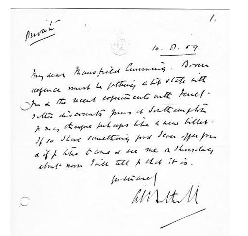 One of SIS’s founding documents: the letter of 10 August 1909 from Admiral Alexander Bethell (Director of Naval Intelligence) to Mansfield Cumming offering him ‘something good’, which turned out to be appointment as Chief of the new Secret Service.