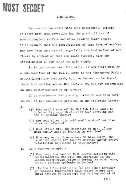 SIS’s consideration of offensive sabotage operations clearly also informed thinking about the defensive side. In July 1938 Sinclair sent Ismay ‘Scheme D’, some notes prepared by Section IX ‘on the protection against sabotage of power stations and H/T [high-tension] transmission lines’. The following August he sent him a paper on bacteriological warfare, which reflected further work in Grand’s section. The ‘possibilities of this form of warfare’, it asserted, ‘may have been under-rated, especially the destruction of our flocks by anthrax or foot and mouth disease, also the contamination of our water and milk supply’. Various scenarios were raised: ‘Can, say, one hundred Nazi agents supplied with bacteriological material and operating in the London Underground Railways during the rush hours, start a serious epidemic in London?’ Reflecting a more innocent age, when even the prime minister had a conventional, daily doorstep milk delivery, the memorandum asked: ‘Is the Prime Minister’s (or any other persons’ of national importance) milk boiled before use? (Milk bottles on doorsteps can be tampered with.)’