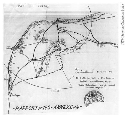 A sketch map of German defences at the Pas de Calais made by a Service Clarence agent in November 1943.