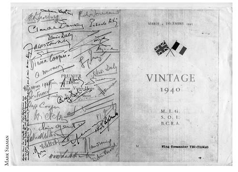 The resistance hero ‘Tommy’ Yeo-Thomas’s menu from a dinner for British and French colleagues celebrated at Prunier’s restaurant in Paris, 4 December 1945. Among the signatories are Stewart Menzies and Claude Dansey.