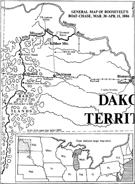It was not the value of his loss that annoyed him: the Elkhorn boat was worth a mere thirty dollars. But he was, by virtue of his chairmanship of the Stockmen’s Association, a deputy sheriff of Billings County, and bound (at least by his own stern moral code) to pursue any lawbreakers. Besides, he had been intending to use the boat on a cougar hunt that very day, and his soul thirsted for revenge. He knew very well who the thieves were: “three hard characters who lived in a shack, or hut, some twenty miles above us, and whom we had shrewdly suspected for some time of wishing to get out of the country, as certain of the cattlemen had begun openly to threaten to lynch them.”18 Charges of horse-stealing had been leveled against their leader, “Redhead” Finnegan, a long-haired gunman of vicious reputation. (During the previous summer he had blasted half the buildings in Medora with his buffalo-gun, in consequence of a practical joke played on him while drunk.)19 Finnegan’s associates were a half-breed named Burnsted, and a half-wit named Pfaffenbach. All three men must be desperate, or they would never have made a break in such weather; if chased, they would certainly shoot for their lives.