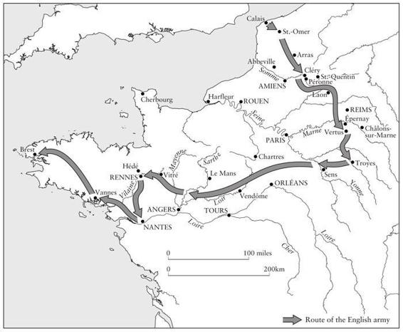 The familiar story of destruction and ruin is traced in the records of the towns and churches of Picardy. After the whirlwind had passed by, the Benedictine monks of Mont-Saint-Quentin left their refuge behind the walls of Péronne to survey the damage. The English army had advanced across a front at least twenty-five miles wide, leaving in their wake barns, farmhouses, mills and bakehouses reduced to burned-out stumps. Hundreds of acres of prime farmland were wasted so completely that it was years before tenants could be found for them. Villages had been abandoned by their inhabitants which would not be reoccupied for a generation. When the English army reached the open plain of Champagne they took to demanding food from walled towns as the price of leaving the villages around untouched. There was no response, and the destruction continued unabated. The smoke rising from sixty villages whose inhabitants had taken refuge in Reims failed to persuade the city to send out supplies. As the English marched on, the scale of the destruction mounted. In mid-August the town of Vertus was reduced to a charred waste as the inhabitants looked on from the walls of the citadel, the second time in a generation that this had happened to them. The fine suburban properties which they destroyed included the home and vineyards of the courtier and poet Eustache Deschamps. All that he had there was ‘burned and charred, captured or destroyed’.58
