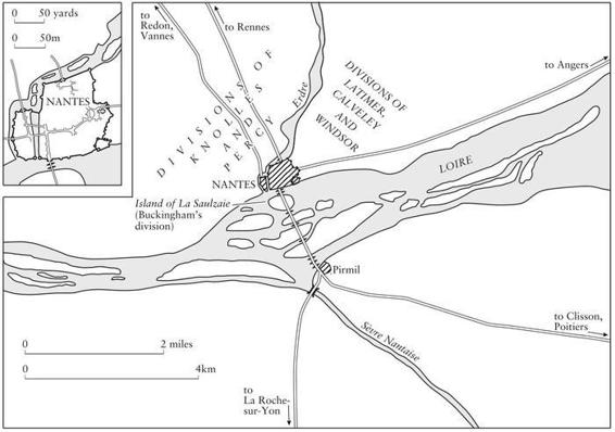 Nantes was a rich city, living well on the trade in wine and salt, which had suffered comparatively little from war damage. It was a difficult place to besiege. It had a powerful and complete circuit of walls. It was relatively compact, not much more than a thousand yards in circuit, which meant that it could be defended by a modest garrison with the support of the citizens. The town and the plain north of the walls were divided by the River Erdre. The Loire, then unembanked and more than a mile wide, was divided into fast-flowing branches running between a number of large islands. The Earl of Buckingham was obliged to divide his army around Nantes into three more or less independent forces. Latimer, Calveley and Sir William Windsor encamped on the eastern side of the town. Knolles and Percy covered the west beyond the Erdre. The Earl himself occupied La Saulzaie, an inhabited island in the Loire directly opposite the river gate of the town. None of these divisions were in a position to reinforce each other quickly in the event of an attack and even with 5,000 men they were unable to seal off the whole city. At the outset of the siege the Earl sent a hurried appeal to England for reinforcements. He said that he needed at least 2,000 more men urgently. While the Council struggled to provide them, his operations depended on the promises of the Duke of Brittany. But John de Montfort was nowhere to be seen. The Earl sent him a stream of messages, none of which was answered. In Paris the newly crowned King made hisjoyeuse entrée into the capital on 11 November, welcomed by ecstatic crowds and by innumerable petitioners waiting for the ordinary business of government to resume. Among the petitioners were the ambassadors of the Duke of Brittany. As soon as the festivities were over they agreed an indefinite truce with the French royal Council. On 19 November 1380 John de Montfort appointed four prominent noblemen, all of them associated with the Breton league of the previous year, to negotiate in the utmost secrecy a permanent settlement with the Regent.72