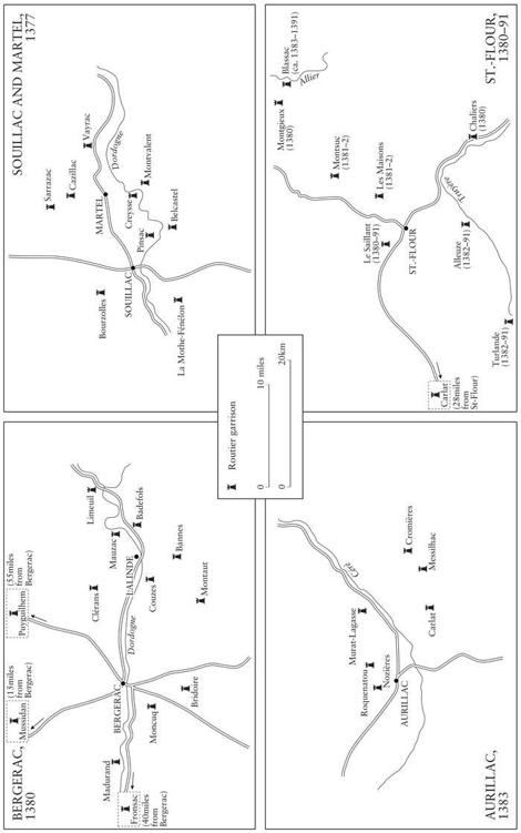 Whether by accident or design Bertucat d’Albret’s return from England marked the beginning of a fresh surge of routier activity across the whole of southern France. The largest concentration of routier companies remained the ten to fifteen garrisons associated with Carlat, which had always looked to Bertucat d’Albret for direction. They worked together as a single federated company and exercised almost total control over a large swathe of territory in Auvergne and the Cantal extending south into Rouergue and the Gevaudan and east into the Velay. Closely associated with them were the garrisons of at least eight castles in the neighbouring province of Quercy which had been occupied by Bertucat’s own companies and were commanded by two of his lieutenants: Noli Barbe or Barbet, captain of Pinsac on the Dordogne, and Bernard Douat, whose main base was at Montvalent a short distance upriver. North of the vast territory ransomed by the confederation of Carlat there were two distinct groups of garrisons operating from Bas-Limousin who co-operated with the captain of Carlat when it suited them. One group was controlled by Perrot de Béarn and Mérigot Marchès, who generally worked closely together; the other by the Bretons of Geoffrey Tête-Noir at Ventadour. Between them these captains controlled some forty major garrisons on the western slopes of the Massif Central in addition to a large number of minor keeps, church towers and fortified farmhouses which served as local depots and collection centres. Operating on a much smaller scale and over a shorter range there were approximately fifty or sixty garrisons active in the provinces bordering on the Gascon march, in the Agenais, Périgord, Angoumois and Saintonge.24