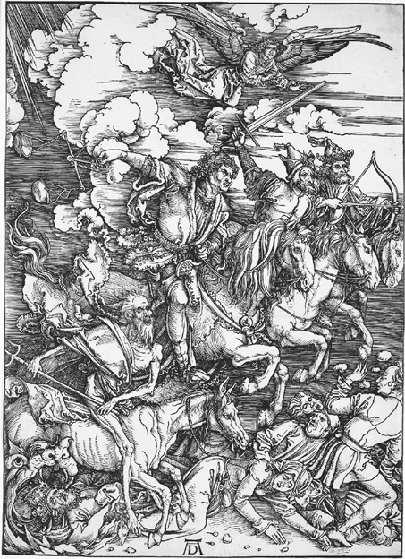 The woodcuts are wonderful, executed with a masterful sense of overall design, anatomical artfulness, and quirkily personal imagination. The most famous of the fifteen is the woodcut of The Four Horsemen, who, though they appear separately in the text of Revelation, are here shown sweeping over the world in concert, urged on by an angel from Heaven, Victory on the far right wielding his unbeatable Parthian bow, accompanied by War with his sword, Famine with his scales, and the pale figure of Death, riding an emaciated nag. In the lower left corner, the loathsome maw of Hell yawns, about to crush a crowned head in its fearsome teeth. The other victims—of lesser station, as their attire reveals—will soon slide toward those jaws of ultimate horror. So no one will escape the final accounting, neither king nor cottier.