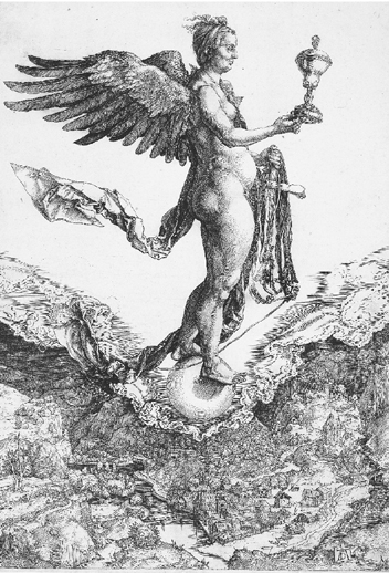 Occasionally, Dürer tried to crisscross the Italianate with the Germanic—to comic effect. One example is the engraving of Nemesis, the Greek goddess of Fate, who had never been depicted by the Greeks or by anyone else (see next page, bottom left). It turns out she looks like a naked middle-aged German frau, whooshing over the South Tyrol on her personal sphere. In her left hand, she holds a bridle and reins, symbolic of her intention to impose discipline. In her right, she offers a Gothic goblet, symbolic of her willingness to reward those who submit to her discipline. Beneath the clouds are the beautiful settlements of the Isarco Valley, whose inhabitants speak Italian as well as German. This goddess is not as awful as she might be, but she’s no Venus, boys. There seems to be a not-so-hidden commentary here on German women, as contrasted with the genuine goddesses of Italy. Perhaps I read too much into this, but we know that Dürer’s arranged marriage was an unhappy one and that he took off for Italy whenever he could get away.