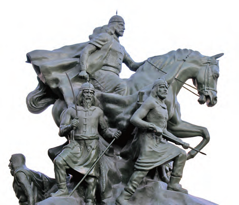 This statue of Saladin, commissioned by Damascus, Syria, in 1992, depicts him as the victor of the Battle of Hattin; at his side are an infantryman and a sufi—sword and faith.