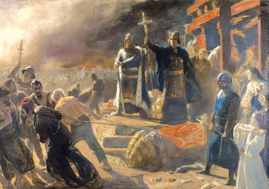 In this nineteenth-century Laurits Tuxen painting, the martial Bishop Absalon of Roskilde topples the statue of Slavic deity Svantevit.
