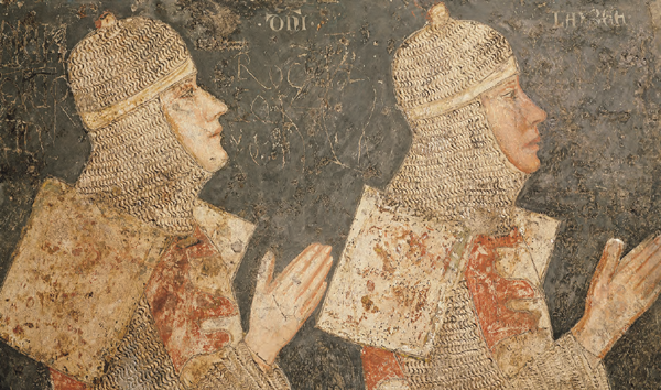 Two crusaders in a medieval fresco, from an Italian cathedral, represent the ideal qualities of a crusader knight: piety and power.