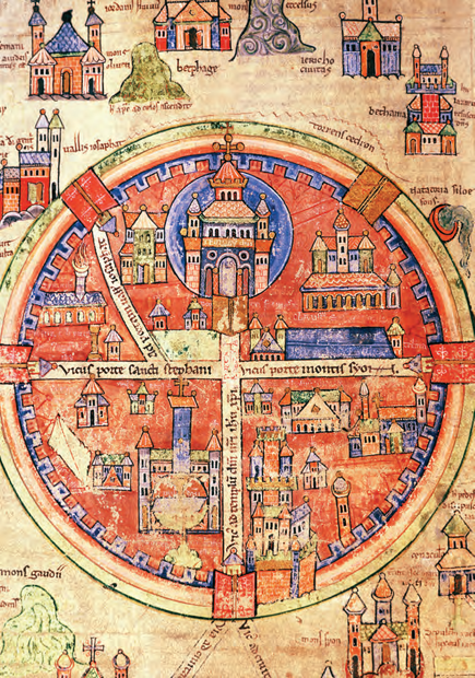 A medieval map from Robert the Monk’s Chronicle of the Crusades (c.1099) shows at its center the holy city of Jerusalem.
