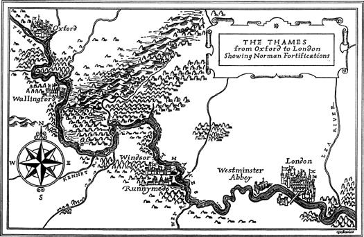 Runnymede, to give it the modern spelling, was an extensive meadow on the south bank of the Thames near Staines where Oxford Street crossed the river. Here the barons had chosen to camp. Its selection had been deliberate, for this sometimes marshy stretch of land had been used by the Druids for ceremonial purposes and later by the Anglo-Saxons for speech-motes. Opposite it was a wooded island of some size, now called Charter Island.